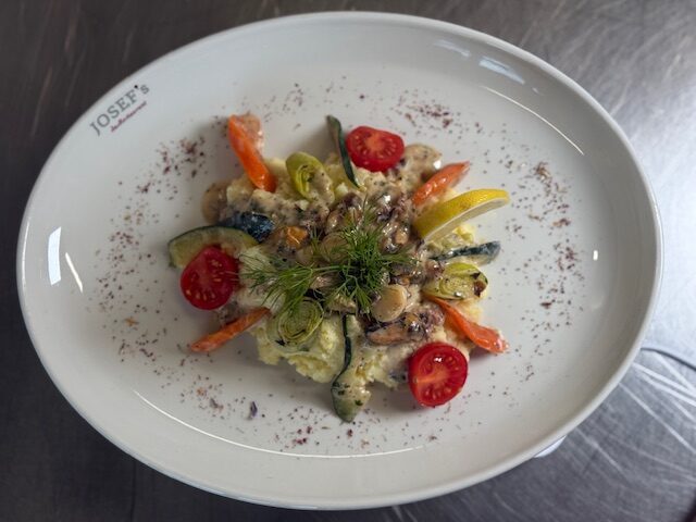 Ein cremiger Eintopf aus Meeresfrüchten mit Lauch, Zwiebeln und Karotten, verfeinert mit Weißwein und Kochrahm. Dazu wird ein luftiges Kartoffelpüree mit Butter und Milch serviert – ein herzhaftes, wärmendes Gericht, das Genuss und Geborgenheit vereint.